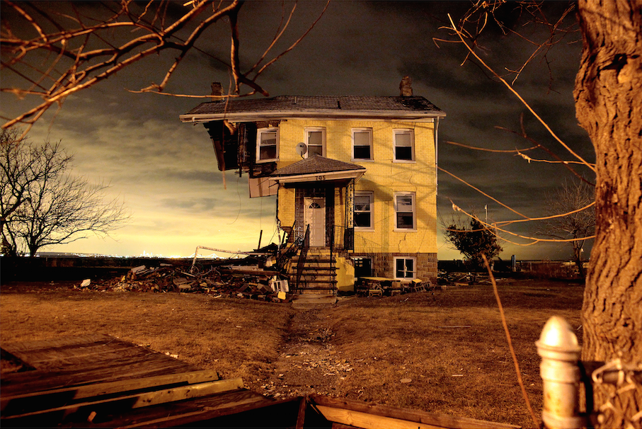The Princess Cottage at night, located at 705 Front Street, was severely damaged in Union Beach, NJ, because of hurricane Sandy. The planet is getting warmer and, as it does, our sea levels keep rising. Few events better put that phenomenon on display than Hurricane Sandy. The 13-foot storm surge is an example of what will, by mid-century, be the “new norm on the Eastern seaboard” says Harvard geologist Daniel P. Schrag. Few were spared in the working-class town of 6,200. More than 500 houses were damaged, and over 110 were destroyed. Homeowners, local officials and contractors swarm in each day, picking up the pieces one brick at a time. Then they vanish each night, leaving Union Beach to its own devices- a haunting silence that sets in every 24 hours when the sun dips behind the horizon.