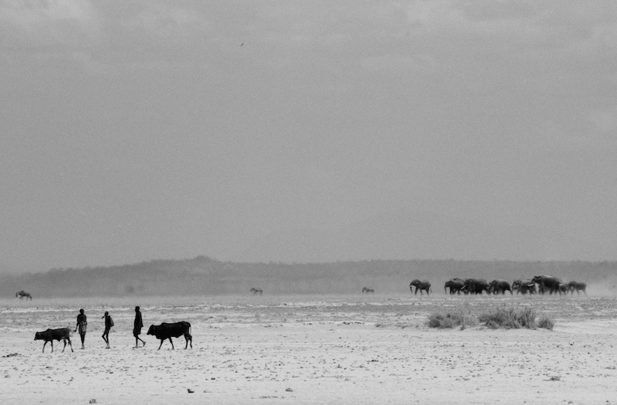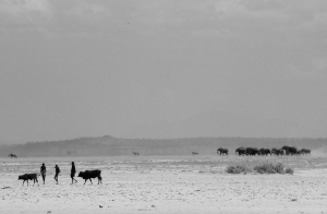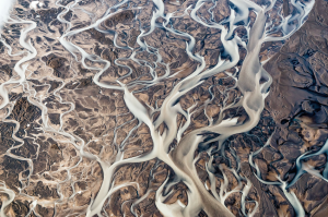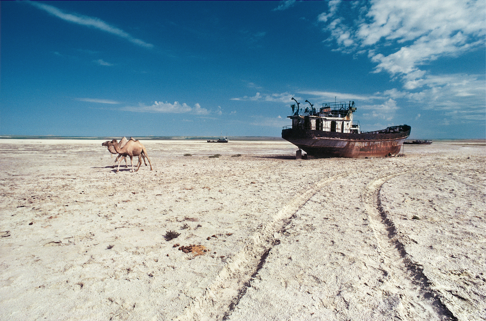 Metaphorically walking on water, camels cross the dry bed of the Aral Sea. A powerful combination of irrigation draining the sea’s feeder rivers and decreasing snowfall in the Pamir Mountains has shrunk the sea’s area to the point where it has disappeared almost entirely. Due to the drying over the past decades, the micro-climate changed significantly. As coastlines receded, the area was plagued by dust storms that contained toxic residue from industrial agriculture and weapons testing in the area. The shrinking sea created this graveyard of rusting shipwrecks, where once the beautiful bay glistened.