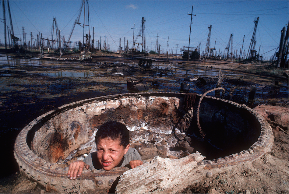 The burning of fossil fuels not only destroys the ozone layer, but in Azerbaijan, dilapidated and leaky pumps of oil rigs create viscous pools of runoff. With forests of rigs in their backyard, the children of suburban Baku have learned to use them as sad substitutes for missing playgrounds.