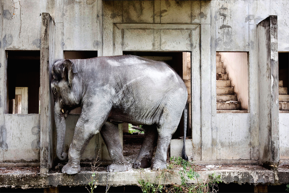 The Bangkok suburb of Bang Bua Thong, surrounded by marshland and hidden among tangled masses of overgrown grass and tropical vegetation, is the home of several hundred squatters, who occupy the abandoned concrete foundations of two-storey townhouse-style living quarters. In the furthest reaches of the complex, unknown even to many of its inhabitants, live five families with their ten domesticated elephants. As if from a classical tale of days gone by, the elephants live side by side with their handlers, or mahouts. Many of the elephants use the abandoned structures as a jungle gym, clambering in and out of the many rooms, some even climbing the stairs to the second floor.