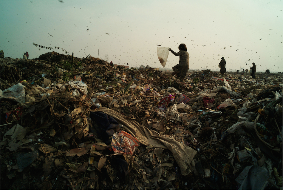 A young Afghan girl carries a sack as she picks her way through freshly dumped waste at Lahore city’s landfill. Beginning work at just four years of age, children search for plastic, glass, paper, wood, leather and fabric that will then be sorted and recycled by their families for money.