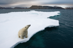 A lone polar bear sits at the edge of a melting iceberg near Half Moon Island in the Svalbard archipelago. During my first trip to these Norwegian-administered high arctic islands, I saw polar bears for the first time in the natural environment. The landscape at 80° north latitude was barren and forbidding, but also hauntingly beautiful.