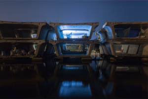 Space Shift take place on the edge of the city near a motorway, where temporary housing units had been erected to provide support for those whose homes had been damaged by the flooding.