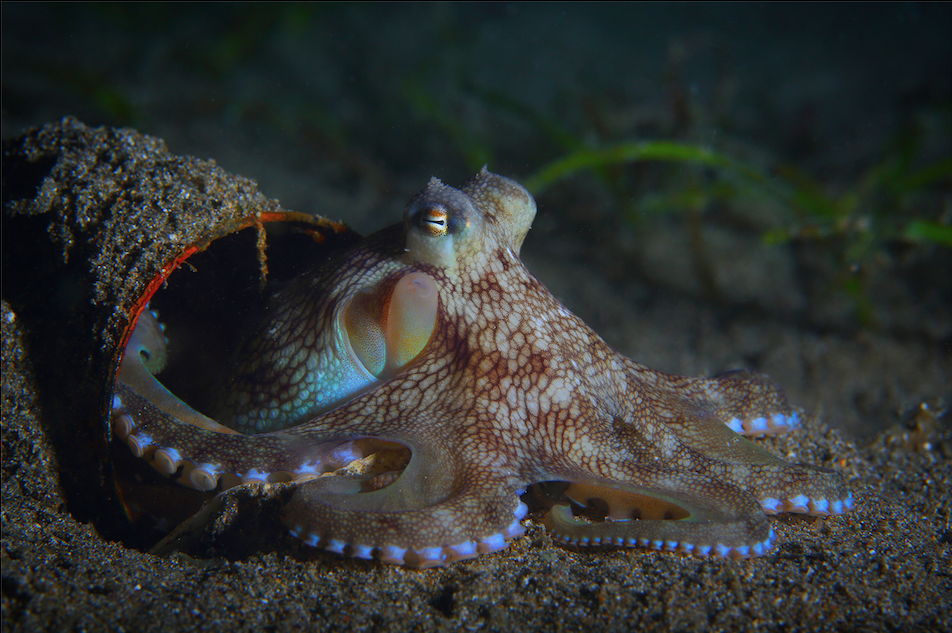 A Coconut Octopus (Amphioctopus marginatus) peeking out of empty oil can. The Coconut Octopus is one of the few marine animals using tools. It is known to pick-up empty coconut or clam shells to use as shelter, hence its common name. These days the octopus has expanded its tool selection and is often observed carrying and using empty cans, jars and other human trash.