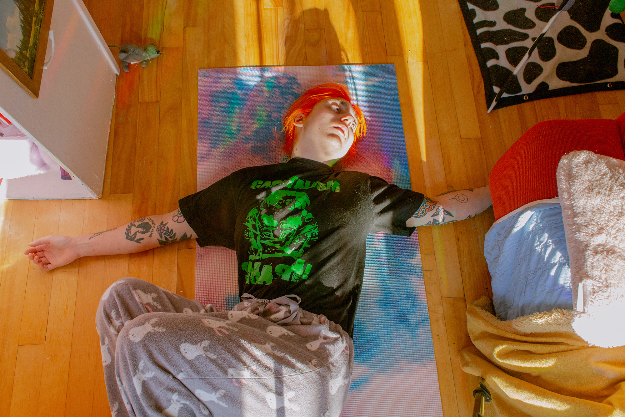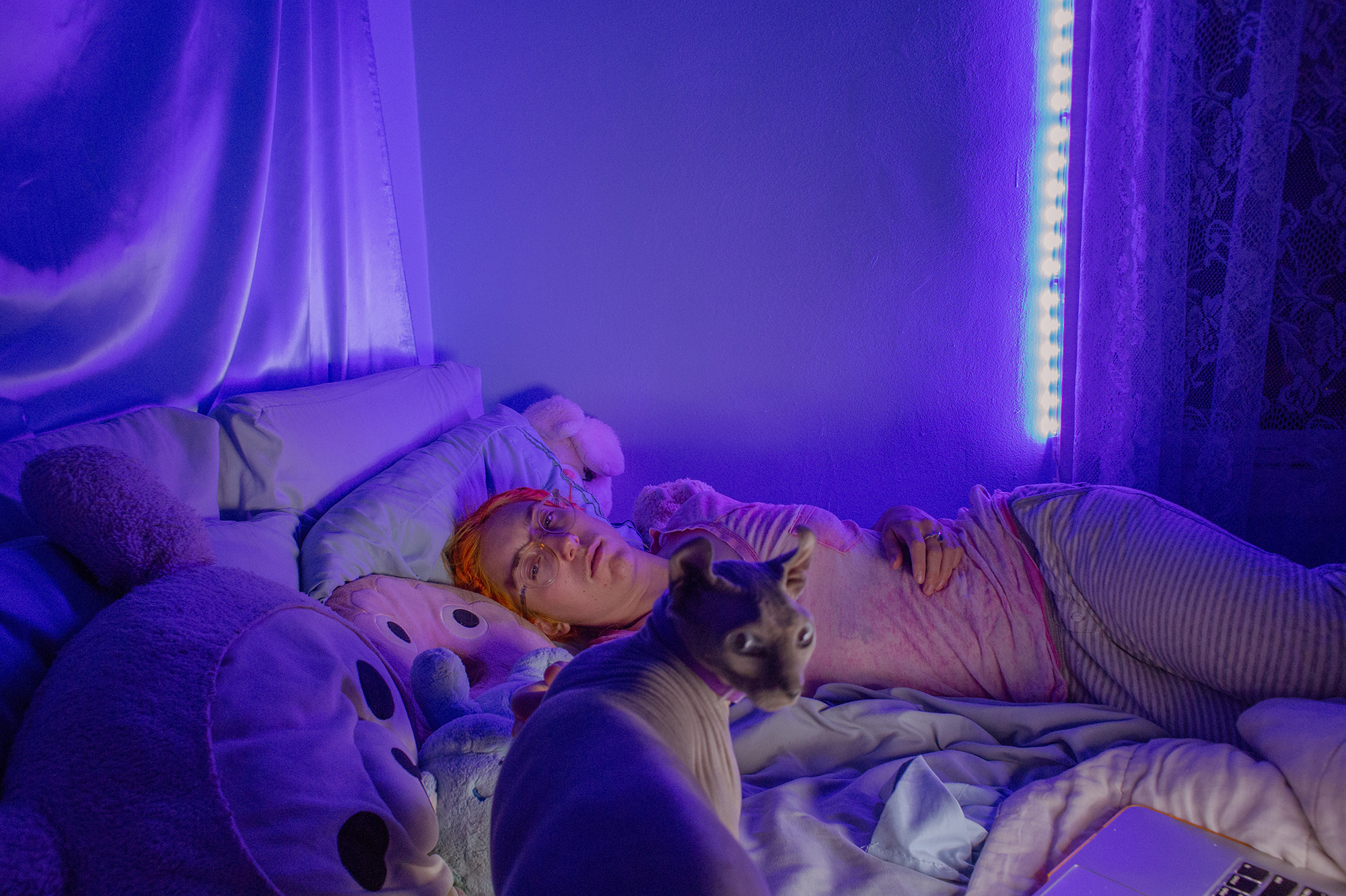 As a photographer whose practice had always revolved largely around self-portraiture, I knew I wanted to document my transition, but I wasn’t sure how to approach it initially. It was very daunting at first because I knew once I started sharing this work, it meant I would also have to be talking about my transition publicly – I wasn’t sure if I had the energy to be explaining myself constantly. I also had to ask myself what kind of images of transition I had not seen before, and wanted to see in the world. Coincidentally, I found myself going through burn out about six months into starting HRT. Burnout forced me to take a few months off, stay home by myself a whole lot, and re-learn how to build self-care routines. After a few weeks of doing that I grew bored and challenged myself to take a picture every day – a challenge which quickly turned into the Puberty project.