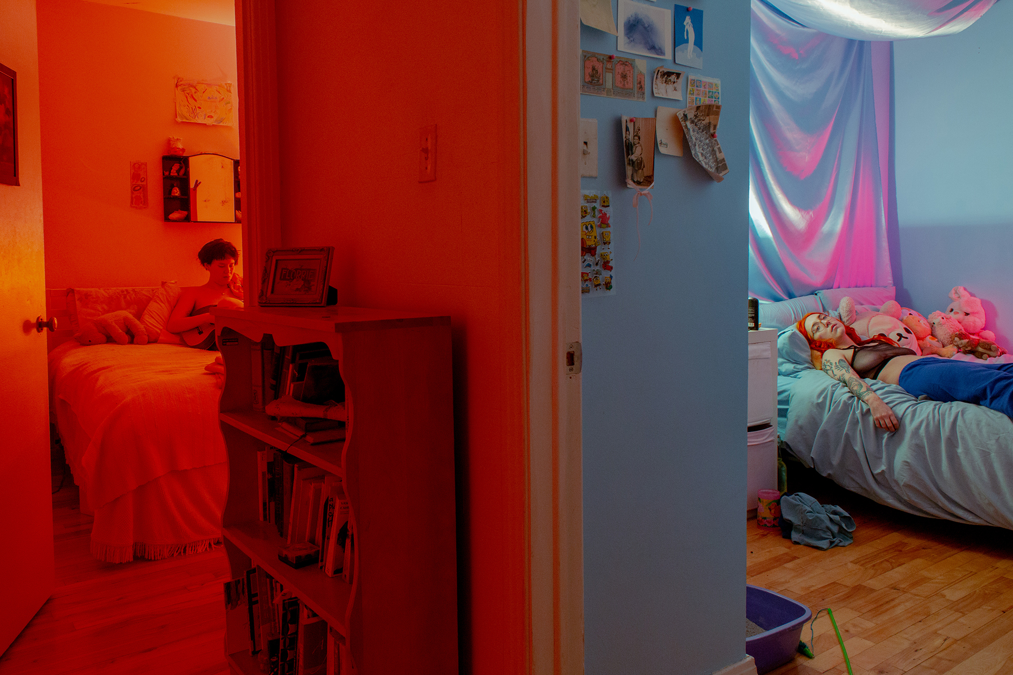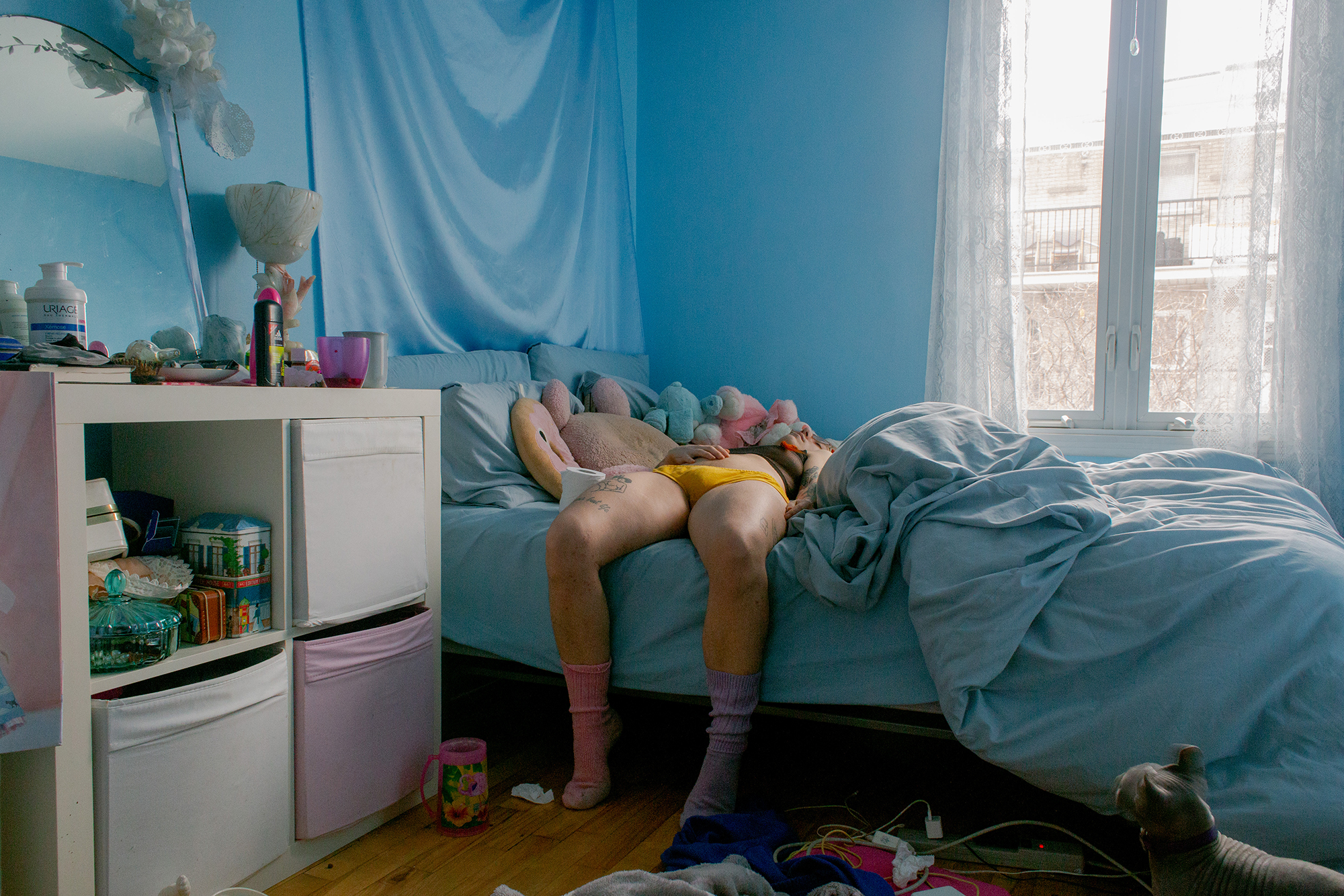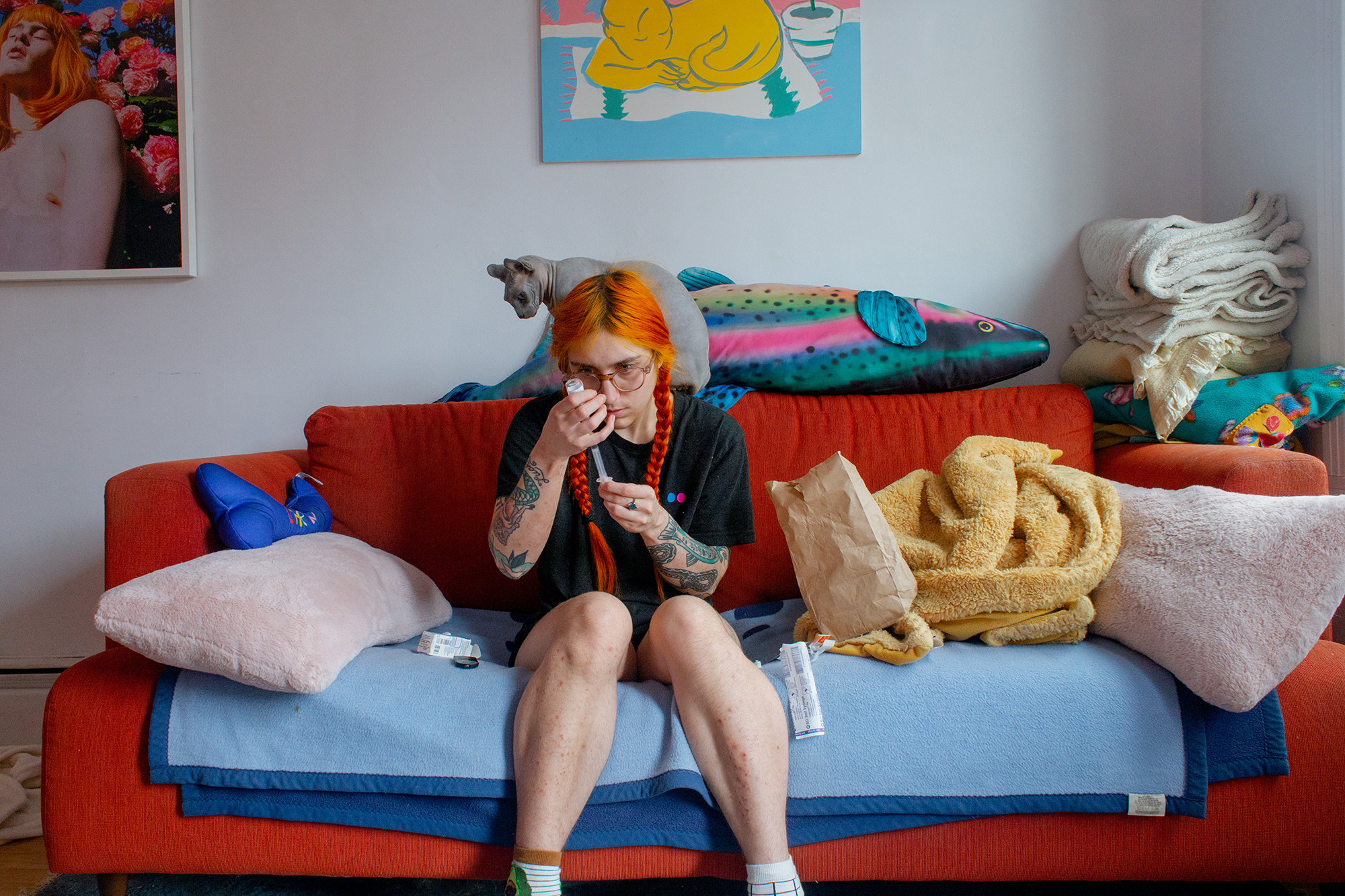 Since January 2019, I have been documenting the changes testosterone generates in my body and moods through a daily self-portrait practice. The resulting images are at once staged and candid, created by setting up a tripod in my home as I go about my daily routines.Set in highly-saturated domestic spaces, these photographs look at minute details of transition which are seldom represented, and examine identity as a space in constant flux.