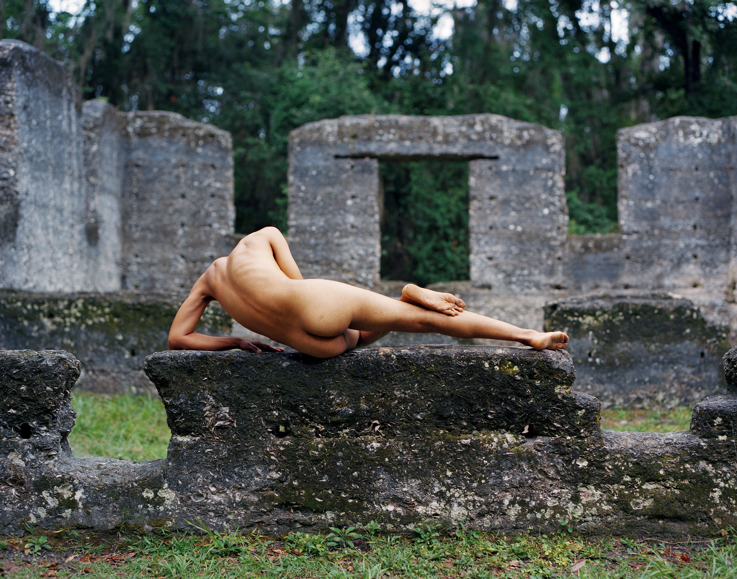 For this project I’ve been going on 3-4 week long trips to South Carolina and Georgia at regular intervals since 2018. Leading up to these fairly short, yet focused, times of image production, I’ll research and catalogue sites that seem suitable for self-portraits, sort through collected archival materials, follow up on loose ends and interests from previous trips, and work on prints of images that seem suitable for the project. While I’m on the road, there’s a loose itinerary of key places to visit with enough time left open to dwell and meander in-between locations. In this process, the self-portraits are staged to the extent of combining a site with a performative self and then working through the image until a suitable gesture is reached. The actual work of shooting the self-portraits and documenting performative motions happens one of two ways. I either use a small analogue self-timer, or rely on the help of my partner Miria-Sabina Maciągiewicz to document my body in motion.